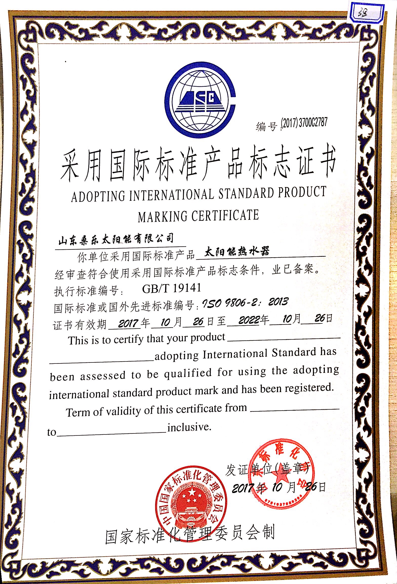 采用國際標準產品標志證書